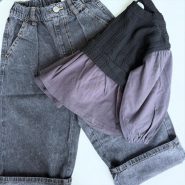 クルミボタンやリボンを装飾品として使っています。布幅をしっかり付けるために2種類の布を使いアシンメトリーにしてお洒落感を更にアップしています。動きやすい、穿きやすいは子供服では第一条件だと思っています。そして他には無いデザイン性のあるものを作っていきます。