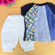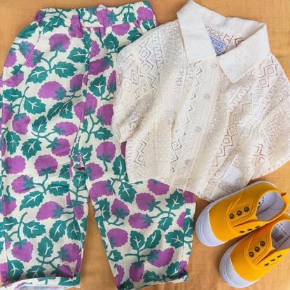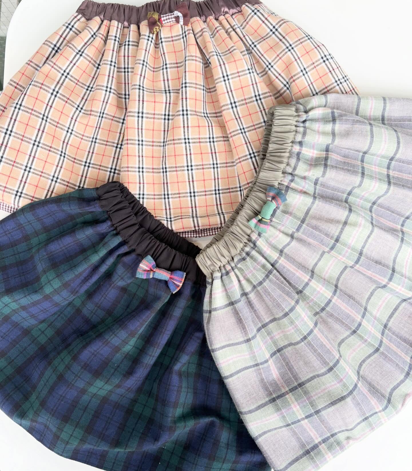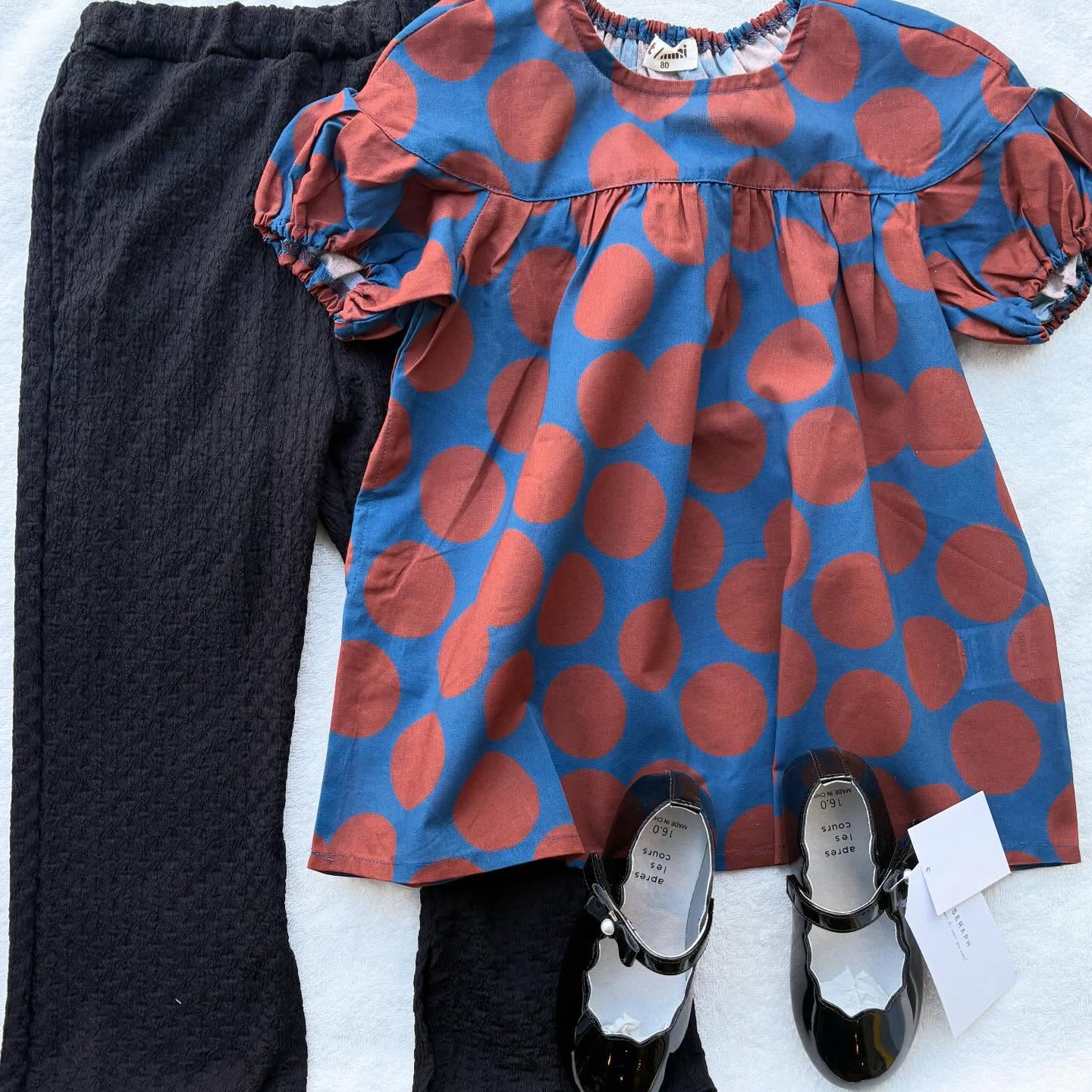 クルミボタンやリボンを装飾品として使っています。布幅をしっかり付けるために2種類の布を使いアシンメトリーにしてお洒落感を更にアップしています。動きやすい、穿きやすいは子供服では第一条件だと思っています。そして他には無いデザイン性のあるものを作っていきます。