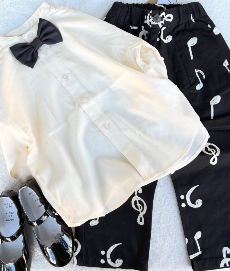 3 2月.2026 春のモノトーンコーデです♪ 音符のボトムは普段着でも可愛いですし、 ピアノ🎹発表会に良さそうです。 男の子も女の子も👧 ローファーと合わせても良いですね。 100から140cm 2200円です♪ シャツは100,130cm 3190円 肌触りもとても良い感じです。